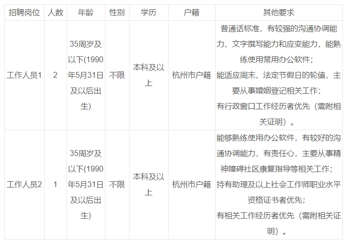 本招聘公告未尽事宜由西湖区民政局负责解释。咨询时间:工作日上午9:00-12:00.下午14:00-17:30.咨询电话:0571-89511430(工作人员1)、0571-89511025(工作人员2)